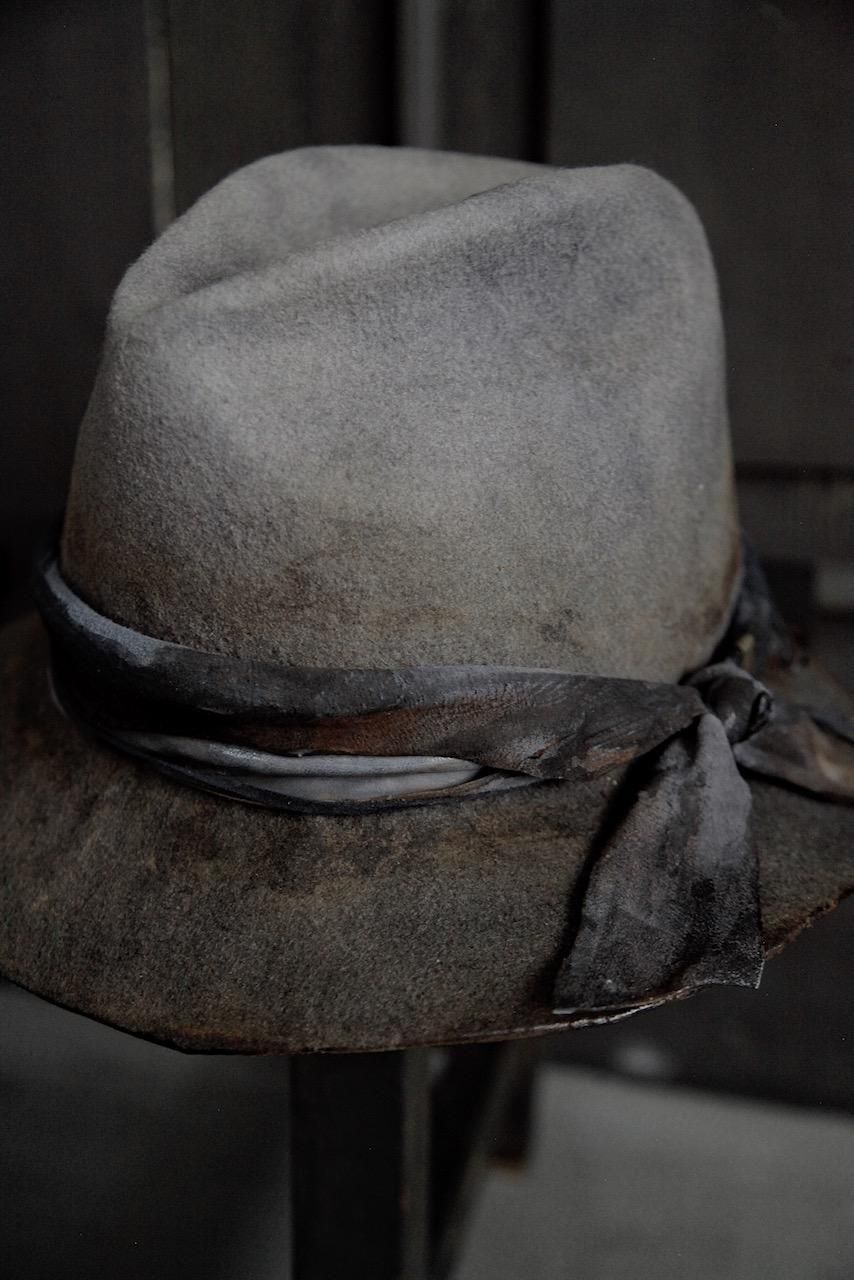 ハットは、デザイナーが所有する多数の木型の中から選び抜いた一つを使用し、ショートブリムとロングブリムの2型を基本に展開。トップの高さや角度など、当店が考えるベストのバランスとなっています。
