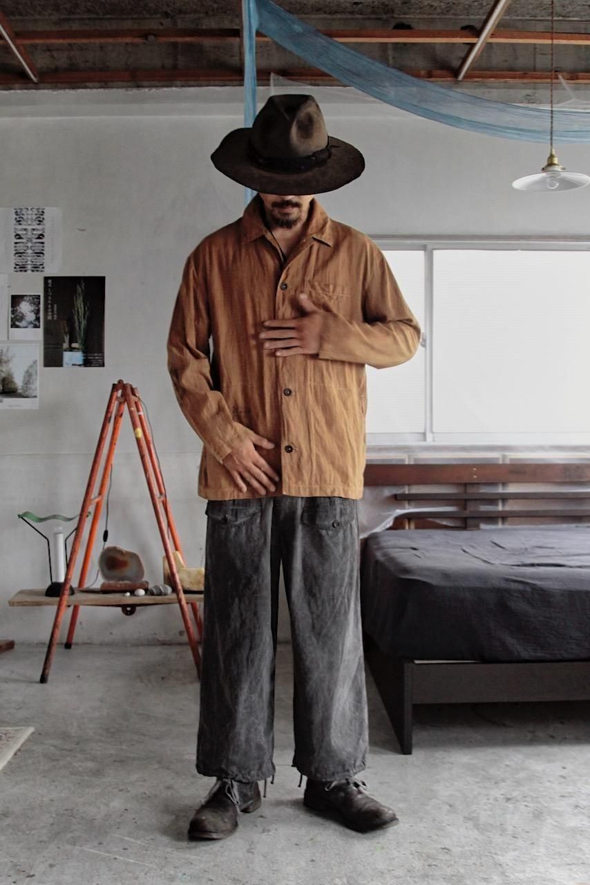 1着ずつ染色し、ボタンも全て手作りしています。手間と時間を掛けて作られた彼の作品は、服でありながら絵画のような芸術性も感じられます。半自給自足で暮らす彼のライフスタイルを尊重し、本当に極少数のみの販売となります。