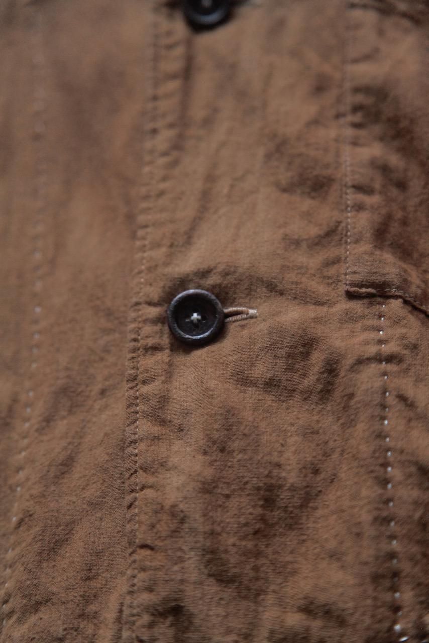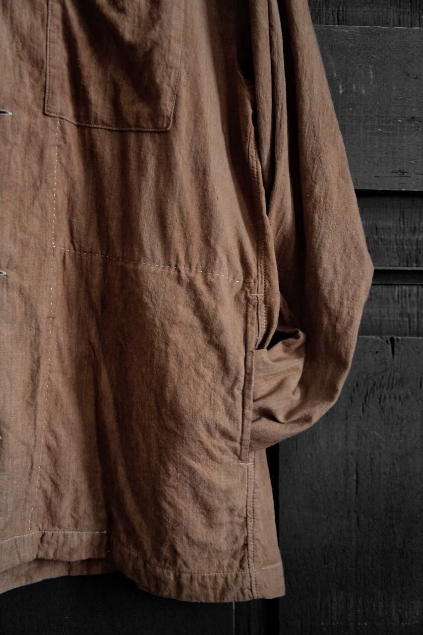本来はタフな生地で制作されるワークジャケットですが、こちらは柔らかな手織りコットン(インド製)を使用して仕立てられていて、型はワークジャケットでありながらシャツジャケットのような軽い着心地となっています。