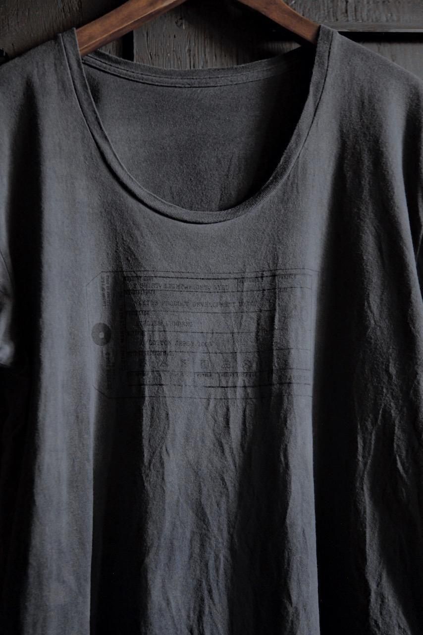 墨で手染めを施し、オリジナルのプリントもY氏に手刷りしていただきました。個人的にTシャツの内側の品質タグが苦手なので、このTシャツ自体の品質表示や洗濯表示をプリントデザインとしました(そのため内側の品質タグはついていません)。